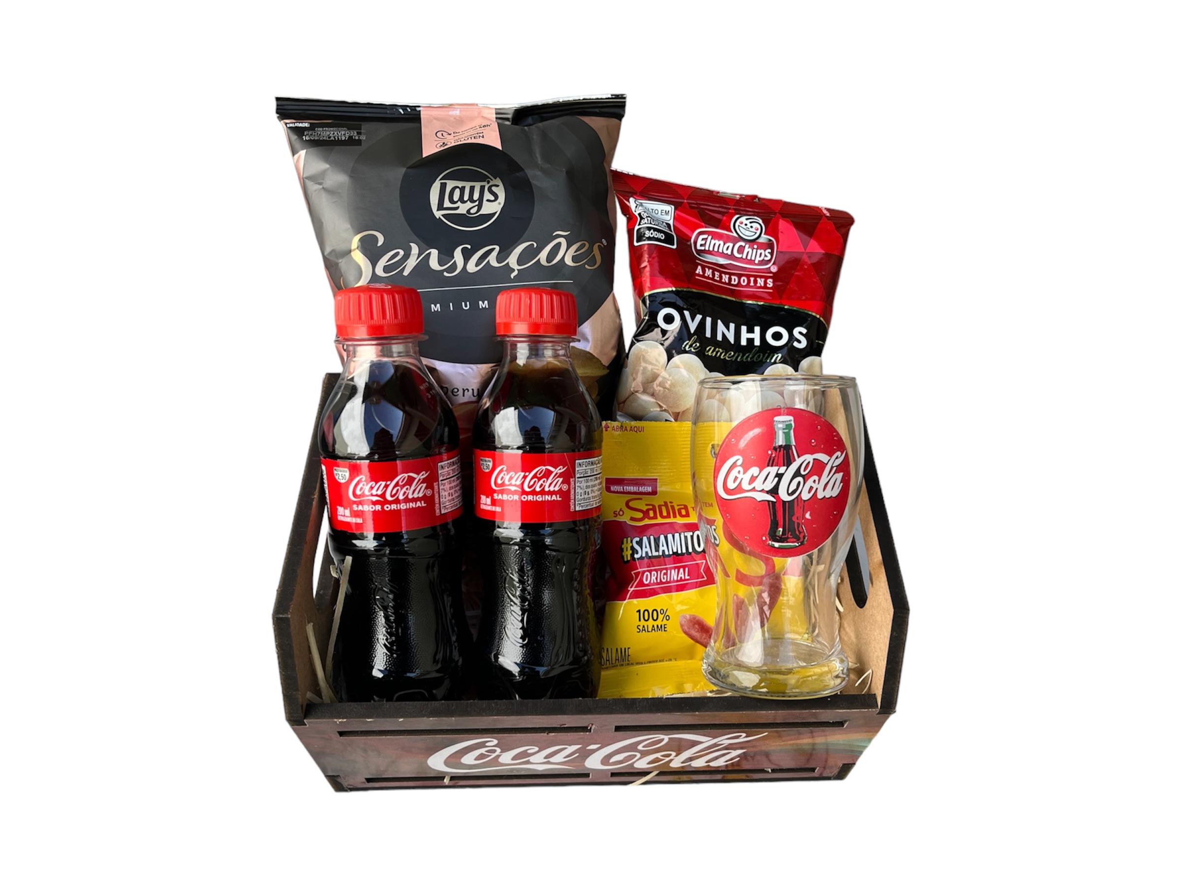 Cesta Coquinha - Lindo caixote adesivado, com refrigerante , salgadinhos e um lindo copo. Um super presente, para refrescar a alegrar qualquer um. Ideal para todas as ocasiões.