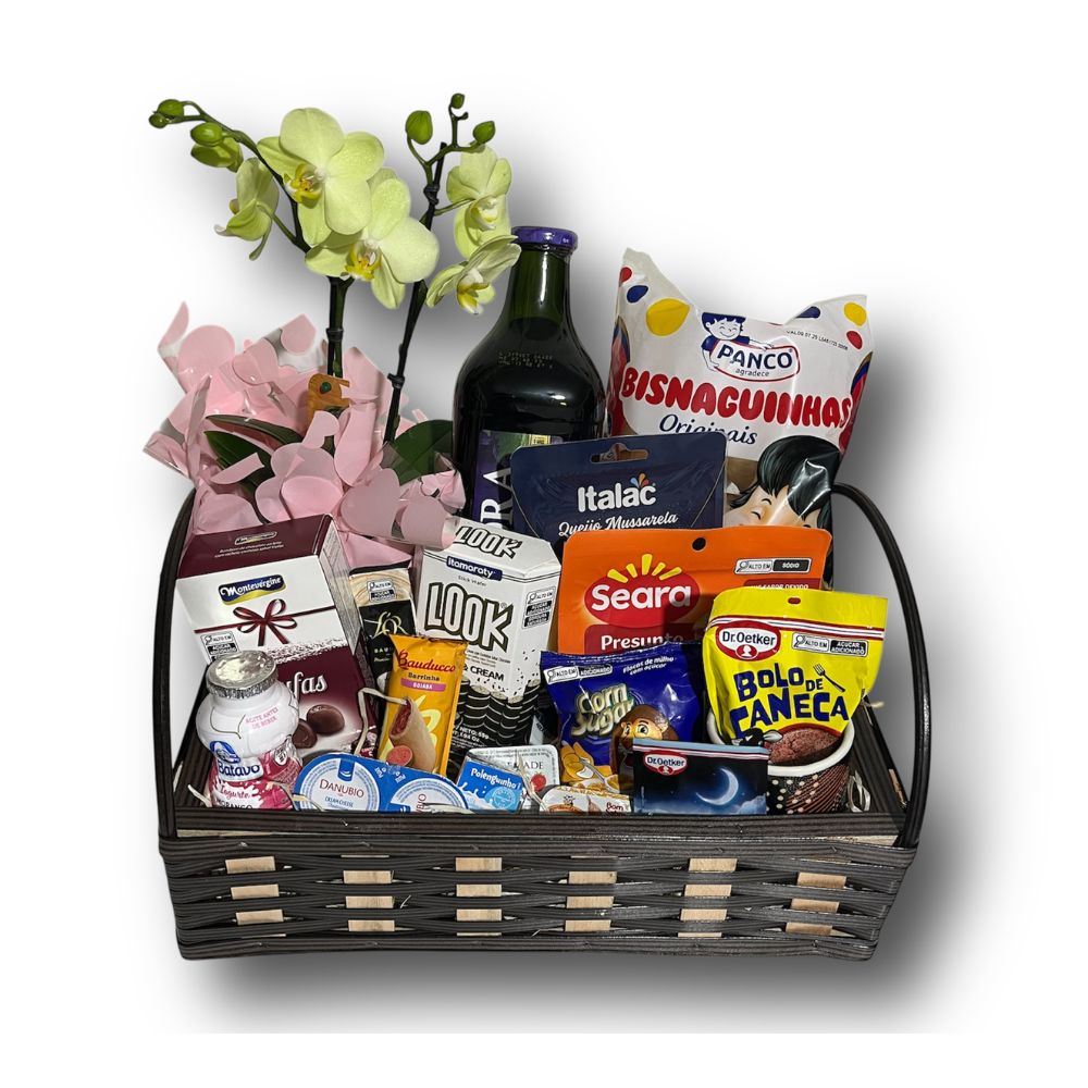 A combinação da orquídea com a cesta de café da manhã transmite elegância, carinho e atenção aos detalhes, tornando o presente ainda mais especial.