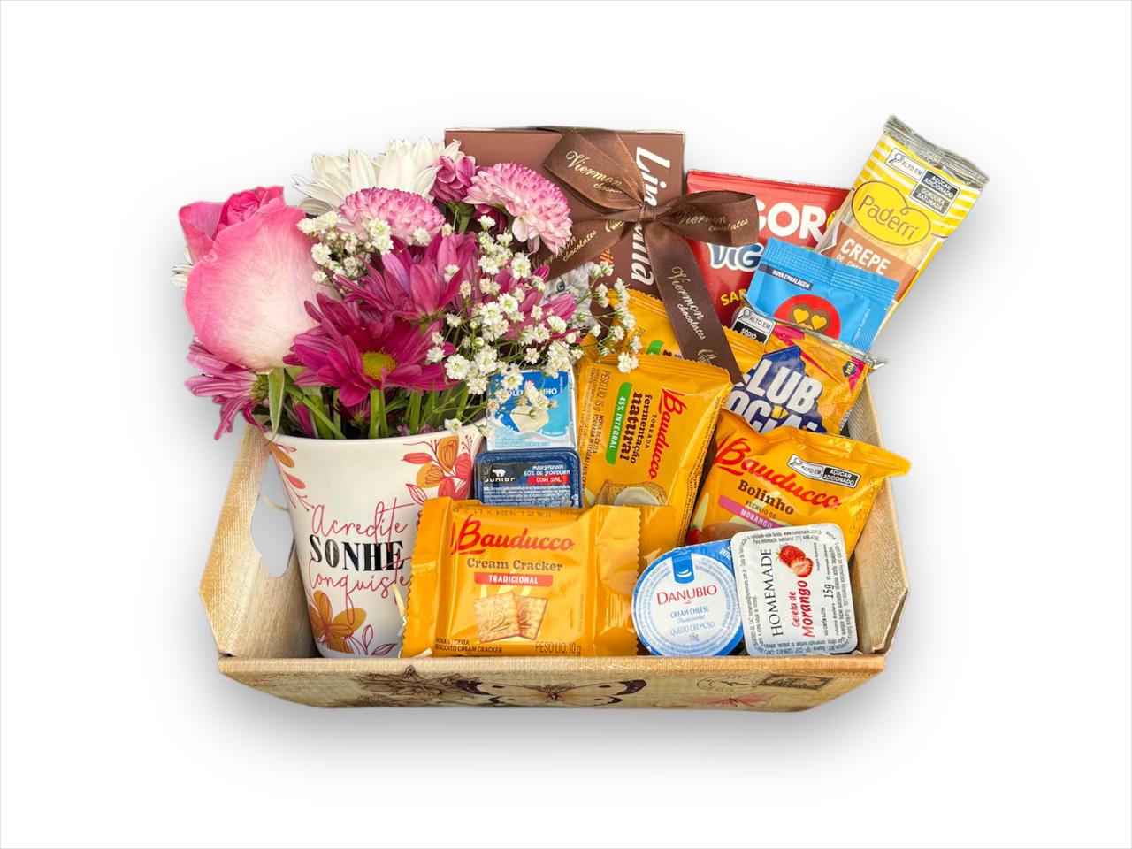 Cesta de Café da Manhã Azaleia - Um deslumbre de Cesta de Café da Manhã composta de itens de Café, Chocolates e Arranjo de Flores. Uma Cesta de Café da Manhã Linda, que a pessoa Presenteada vai Amar. Indicada para todas as ocasiões.
