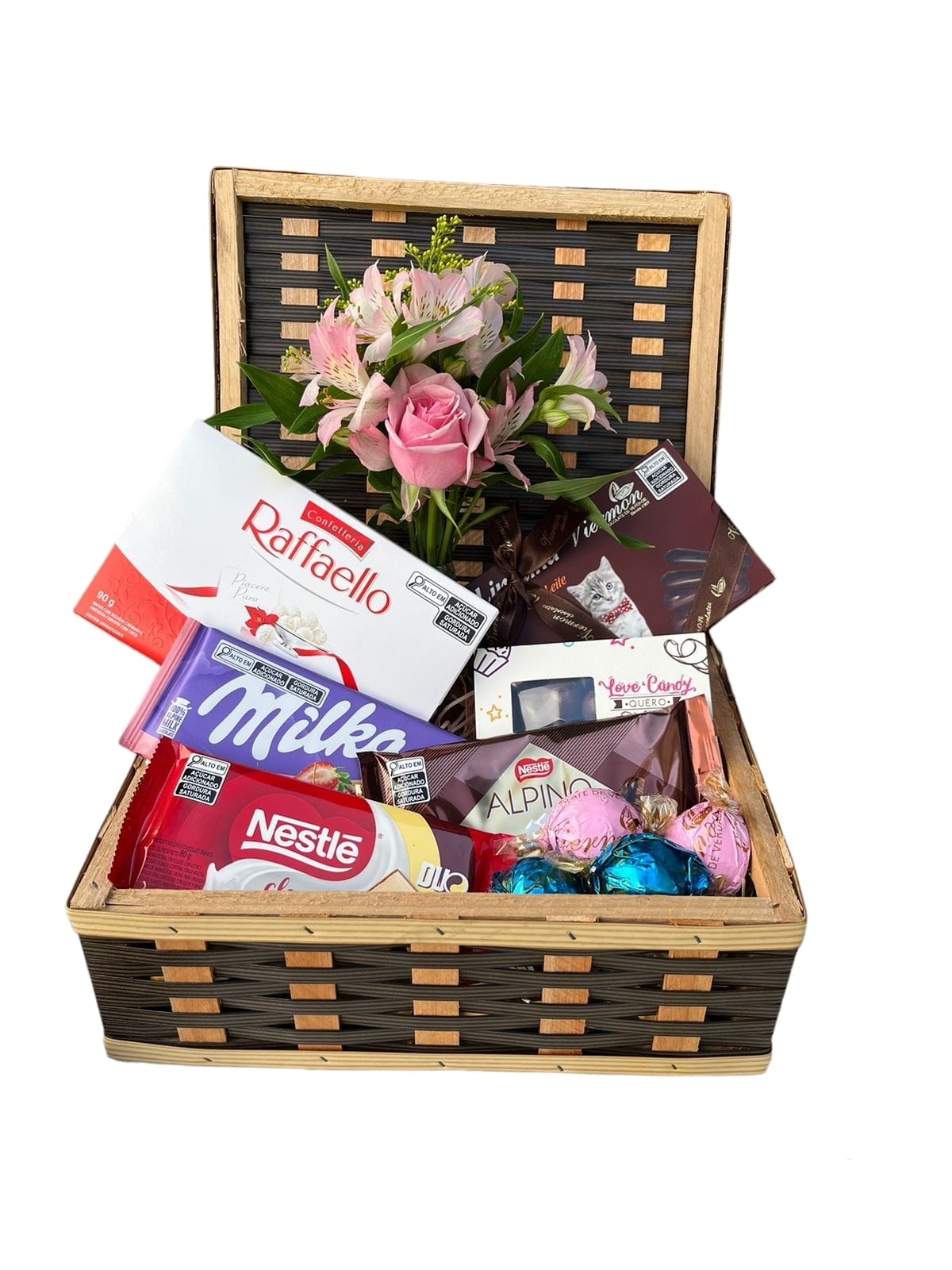 Cesta de Chocolate Baú Ouro - Esta cesta é um verdadeiro sonho! Com uma variedade empolgante de chocolates, incluindo barras de chocolate Milka, trufas , drageas recheadas com licor e bombons Raffaello. O toque especial fica por conta do gracioso arranjo de flores naturais. Uma explosão de sabores e texturas, ideal para quem não resiste a um doce.