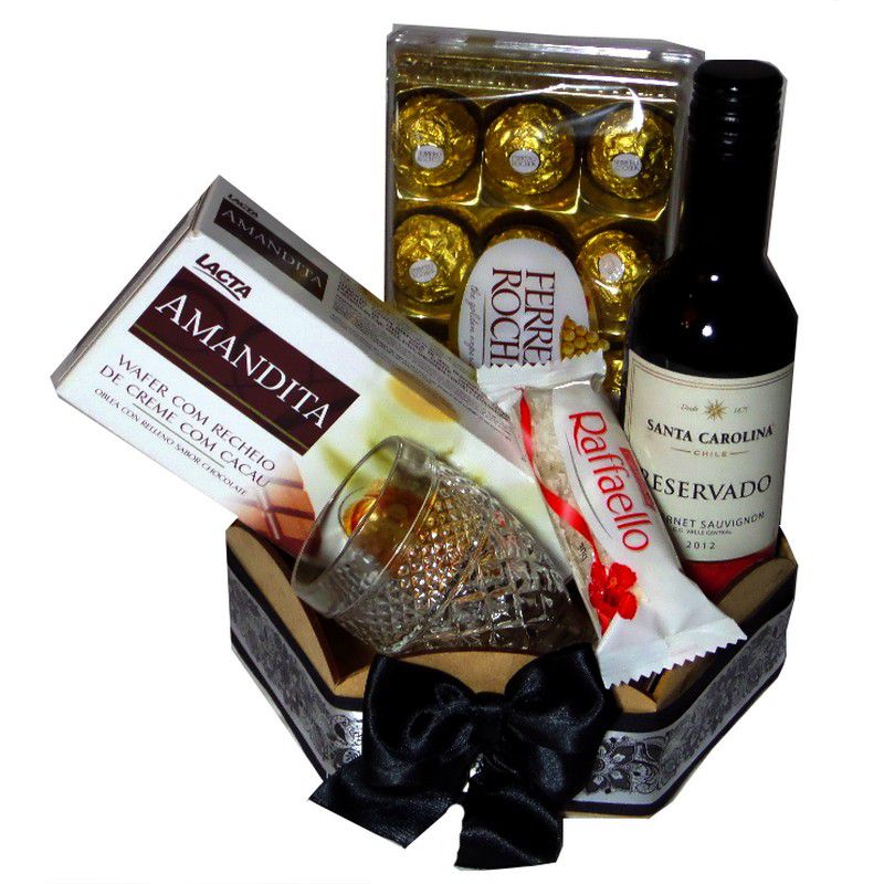 Cesta de Chocolate com Vinho deliciosa para Presentear a pessoa Amada. Deliciosos Chocolates e um vinho para Acompanhar.
